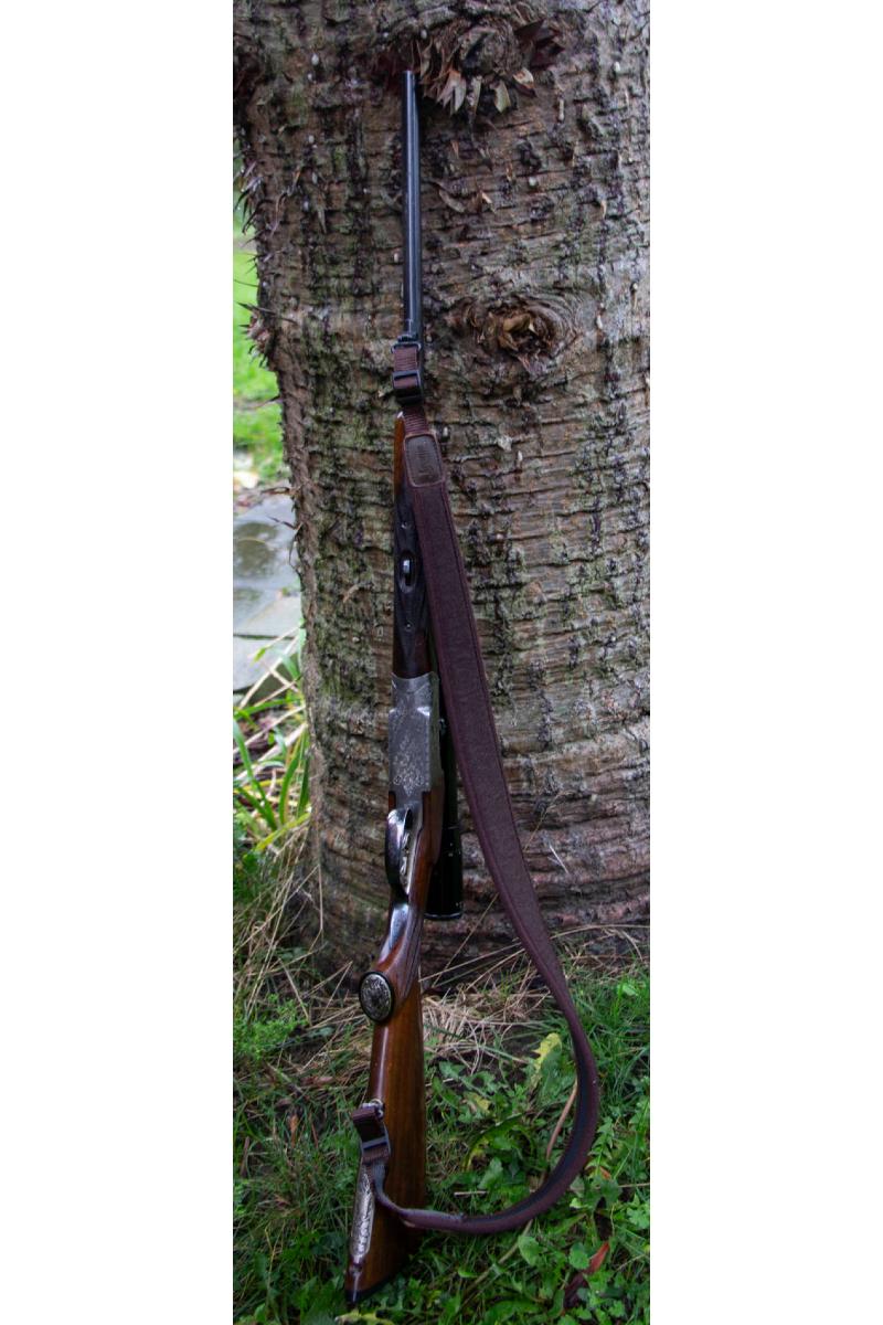 Højkvalitets, robust og skridsikker standard riffelrem. Geværrem i mørkebrun Loden. Skridsikker gummibelægning på bagsiden.