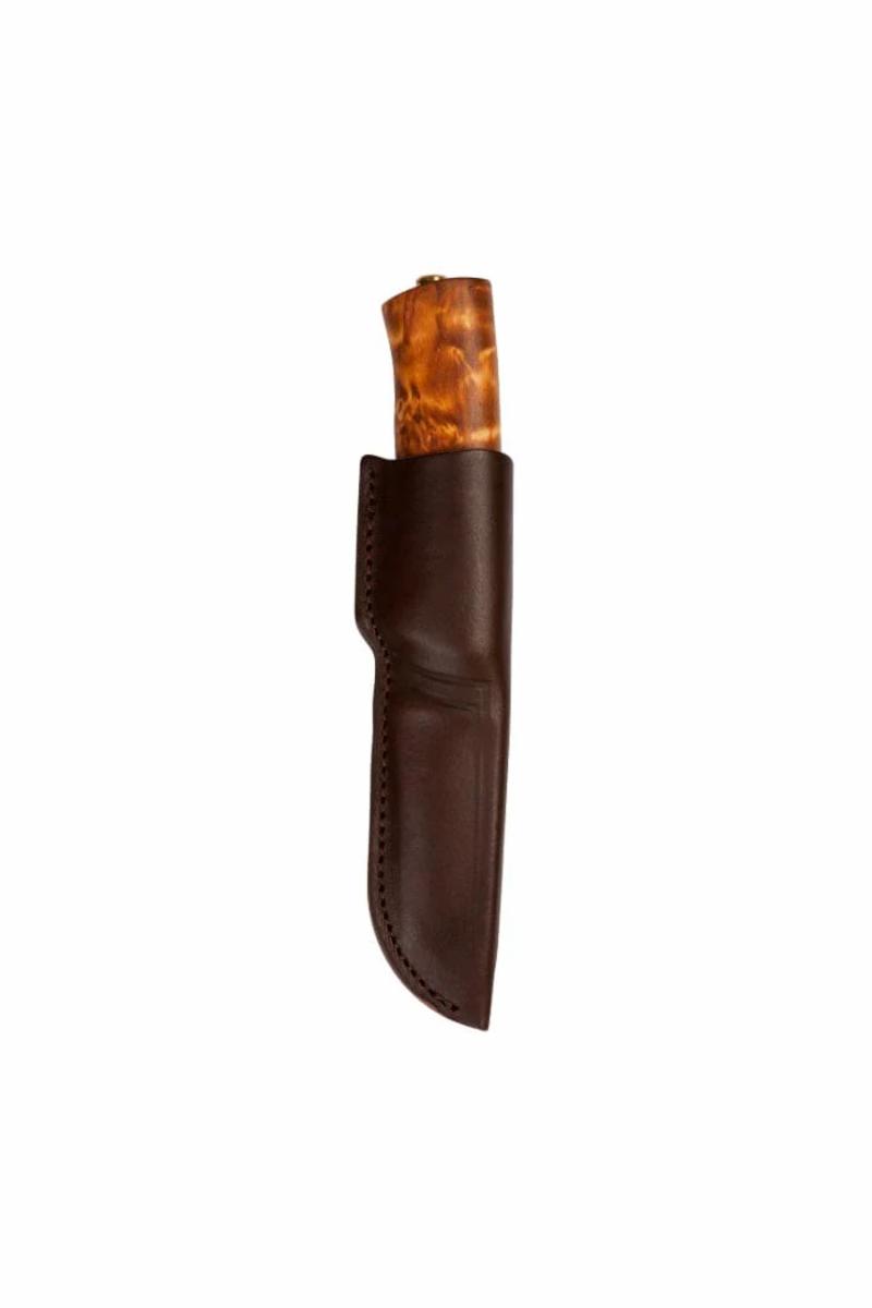 Kniven leveres med en klassisk slire i vegetabilsk farget brunt lær og et praktisk belteoppheng for enkel bæring og tilgang på turen.