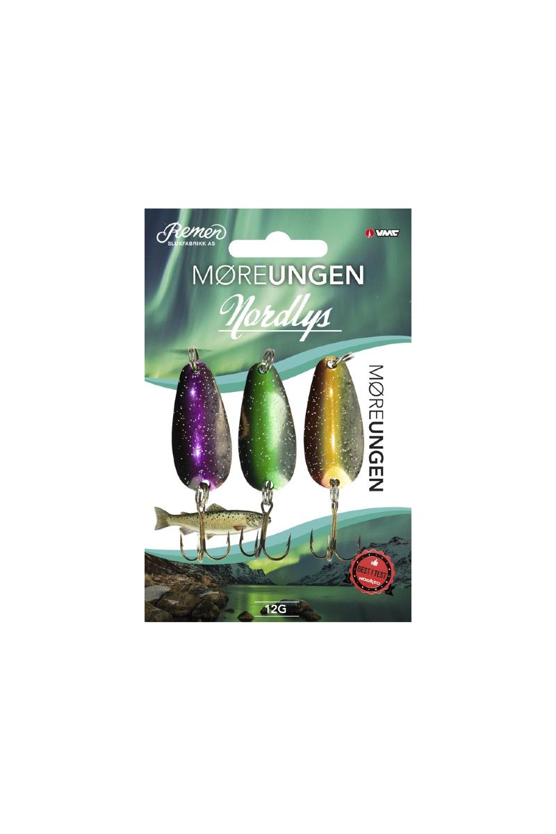 Møreungen Nordlys er en lett og effektiv skjesluk utviklet for ørretfiske i stille og strømmende vann – spesielt egnet ved lav innsveivingshastighet. Den glitrende overflaten gir kraftig lysrefleksjon, som vekker nysgjerrigheten hos fisk selv under dårlige lysforhold.
