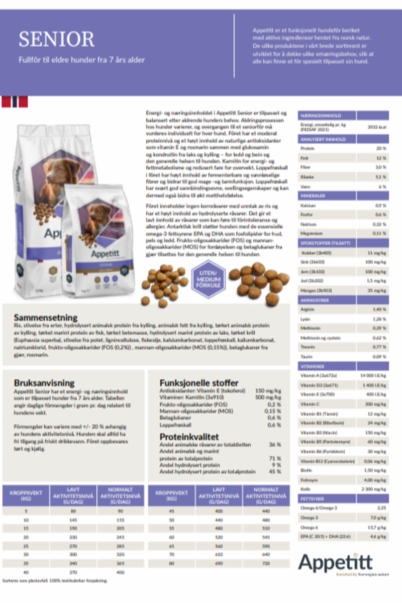 Appetitt Senior har et balansert energiinnhold og et moderat nivå av proteiner, som passer godt til eldre hunders lavere aktivitetsnivå og endrede metabolisme. Overgangen til seniorfôr bør vurderes individuelt, men passer ofte fra ca. 7 års alder – avhengig av rase og størrelse.