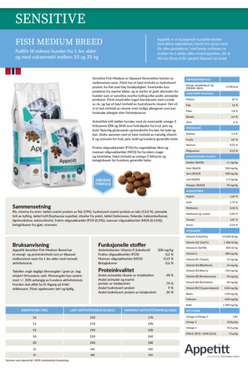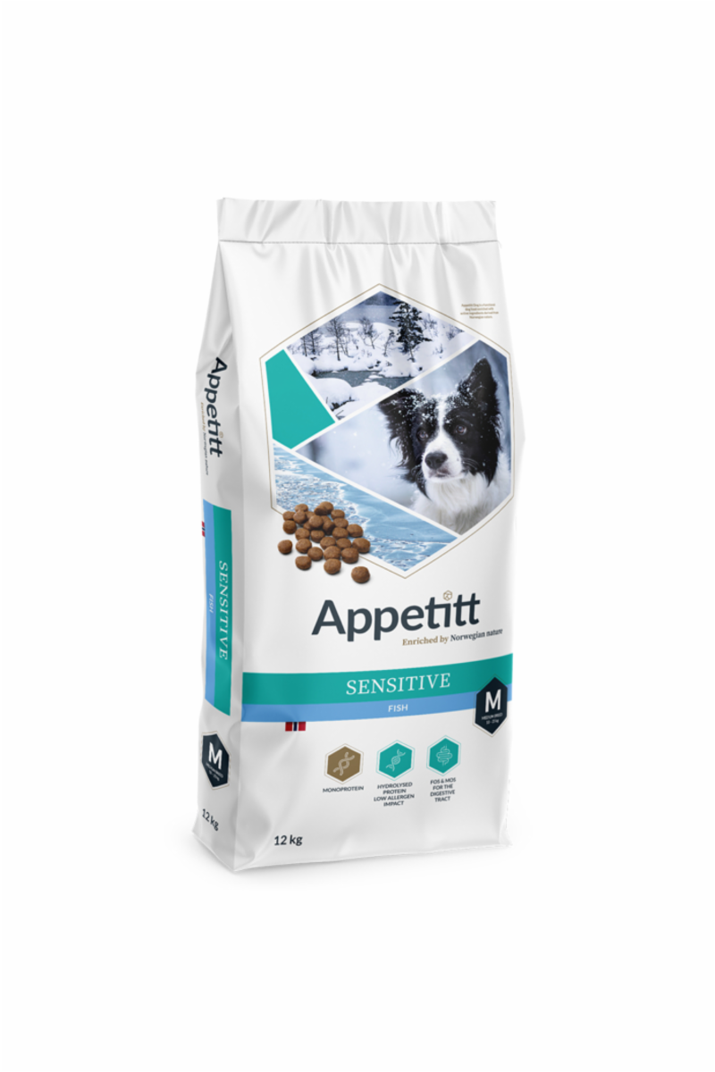 Appetitt Sensitive Fish Medium er et spesialutviklet hundefôr for voksne hunder av mellomstore raser (10–25 kg) med sensitiv fordøyelse, hud eller fôrintoleranse. Fôret er nøye sammensatt med kun marine proteinkilder og skånsomme, lettfordøyelige ingredienser – perfekt for hunder som reagerer på kylling, storfe eller andre tradisjonelle animalske proteiner.